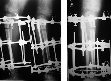 The picture on the right side shows correction achieved in terms of the angle and length. The fuzzy appearance in the bone gap is due to the formation of new bone in the gap. |