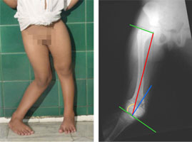 | The blue line marks the normal angle of the distal femur to the knee joint. |