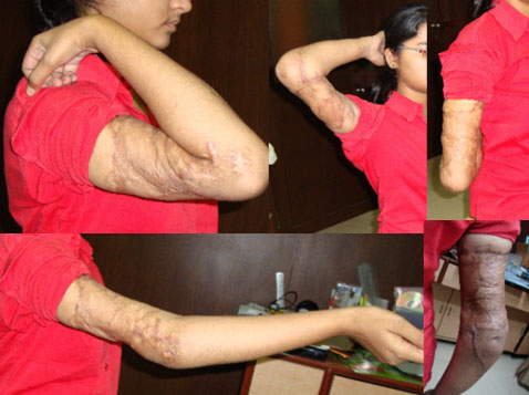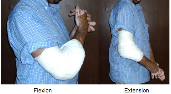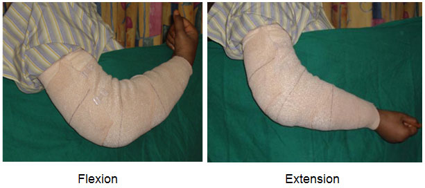 | This 17 year old girl had stiff elbow as a result of an open inter-condylar fracture of humerus following side swipe injury. She underwent multiple surgeries for the same. When she presented to us the fracture had healed, skin graft was healthy but she had only of 50 degrees of arc of motion (40-90) | ||