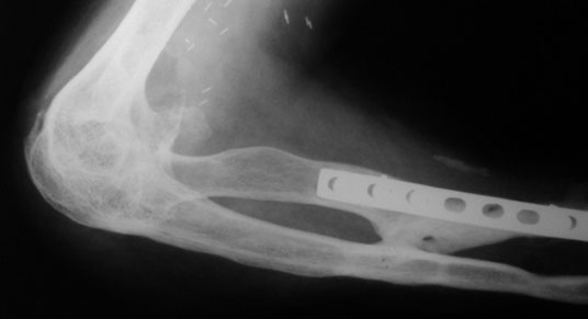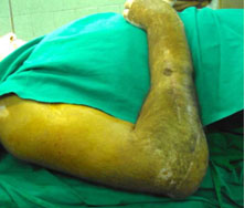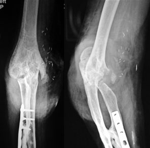 | This 30 year gentleman had been through a lot. He had multiple fractures after a road traffic accident about 5 years ago. He fracture of the right femur, right tibia, both bones of right forearm with fracture of proximal humerus. All open fractures. When he came to us he had a near fused elbow – just a jog of movements. | ||
