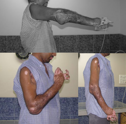 | The excellent functional outcome with a sustained improvement in function as seen at 6 months followup. The arc of motion improved to 110 degrees (20 degrees of extension to 130 degrees of flexion). | ||