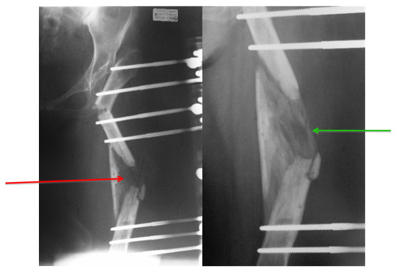 The xray on the left shows the distraction gap (red arrow) to compensate for the shortening. The x-ray on the right shows formation of new bone in the distraction gap (green arrow).