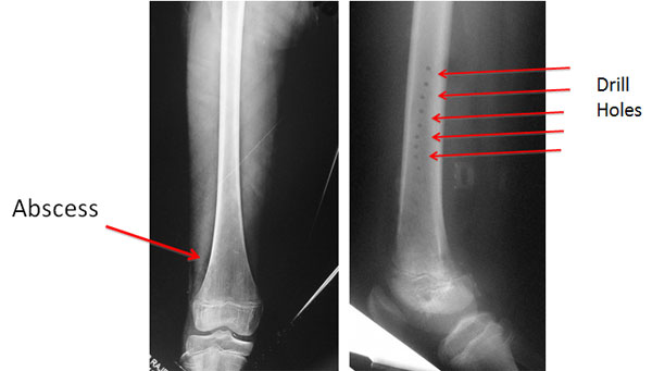 | Acute Osteomyelitis – Infection of the bone and medullary cavity is common in young children in the age group of 3-14 years. The infection presents as severe pain in the affected limb and high grade fever. This young girl of 12 years was diagnosed as acute osteomyelitis. She was treated somewhere else with I&D and Multiple drill holes. |