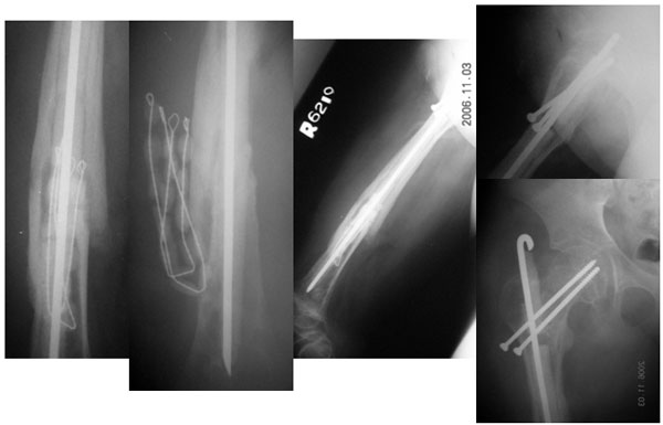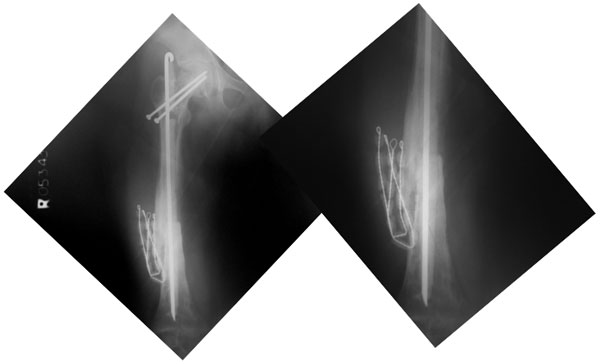 | The X-ray pictures 5 months after the surgery. These were actually taken prior to removal of the antibiotic cement beads. The fractures have healed well, the infection is also settled, with no signs of recurrence and no signs of loosening of the implants. |