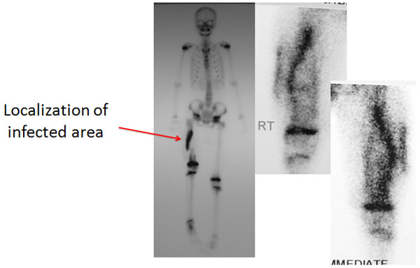 | A bone scan was done which showed the area of infection. The entire shaft was infected on the inner posterior surface. |