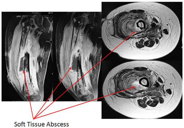 | The MRI showed a significant amount of infection in the soft tissues on the poster-lateral aspect along with the marrow infection. |