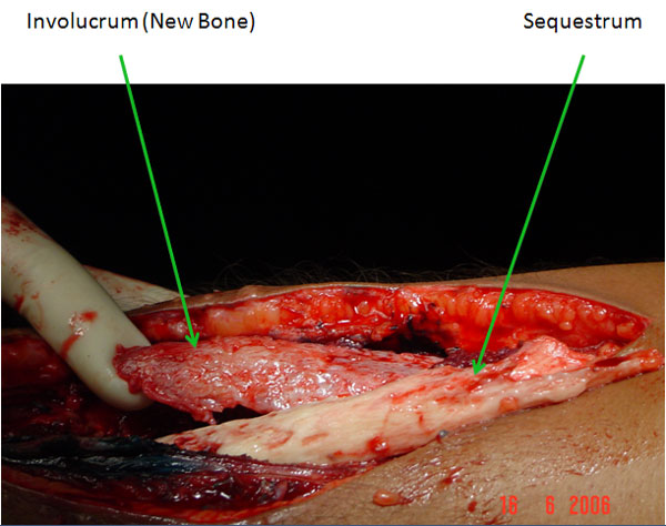 | In children with osteomyelitis, the body naturally tries to control the infection by surrounding the dead bone by new healthy bone, sort of forming a shell over the dead bone. Gradually then over a period of months to years the dead bone is then resorbed or extruded out through breaks in the skin called sinuses. The picture was taken during surgery, shows the appearance of the new bone (involucrum) – which is pink and bleeding and the dead bone (sequestrum) – which is ivory white, doesn’t bleed. |