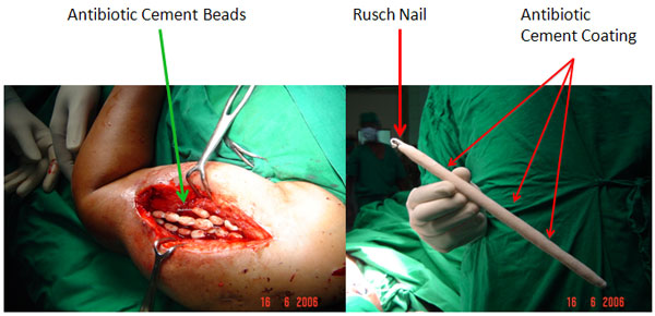 | The Picture on the left shows the placement of antibiotic cement beads in the wound. These are made during surgery using a broad spectrum antibiotic powder mixed with bone cement (PMMA). The beads are then chained on stainless-steel wires for ease of removal. The picture on the right shows the rod (Rusch Nail) on which a thick coating of the antibiotic cement is applied. The idea behind the antibiotic cement is that it allows for a slow release of the antibiotic in the local area. This creates a high concentration of the antibiotic in the local area without any associated systemic side effects. The cement allows for the leeching of the antibiotic for 4-6 weeks, by which time the infection settles down. Another advantage is the avoidance of long-term intra-venous antibiotic (Recommended duration in Osteomyelitis is about 6 weeks of IV antibiotics). |
