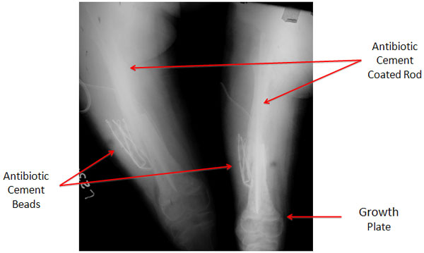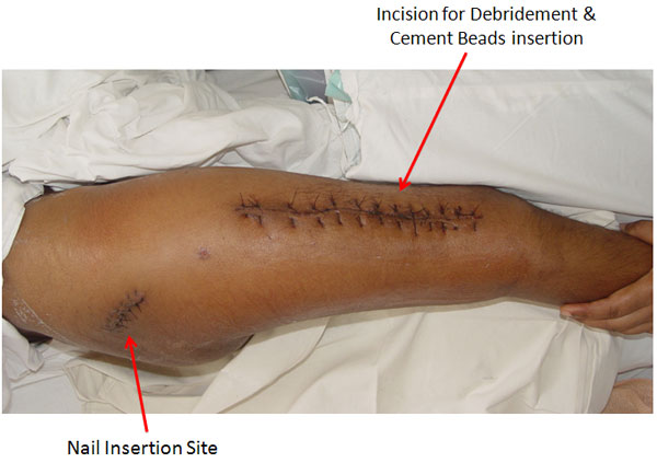 | The post-op x-rays showing the position of the antibiotic cement rod & beads. The fracture has been reduced after removal of the dead bone and tissue. The nail end in the lower portion of femur is just proximal to the growth plate. |