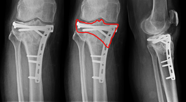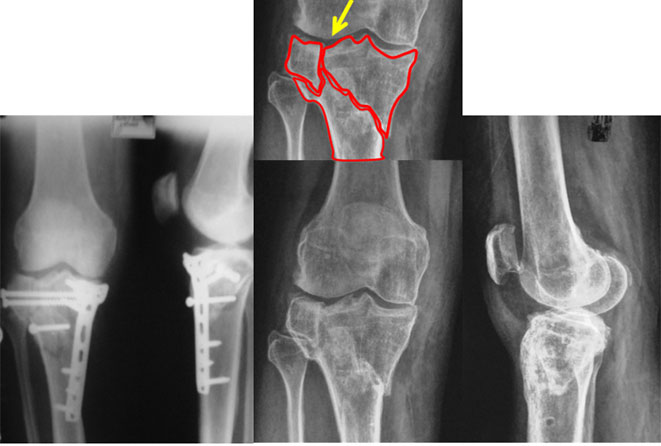 | This 43 year old gentleman had an accident about one & a half years back. He presented to us with pain in the right knee. The plate & screws had been removed about 2 months prior to his visit here. The new x-ray showed malunited fracture (fracture united in wrong position) of the upper tibia as shown in the picture above – the red lines show the fracture lines with the step (yellow arrow) in the articular portion of lateral condyle. |