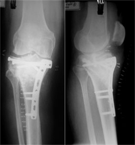 | The x-ray picture at 1 year after reconstruction. The fracture is healed well. There is no articular step now. The osteoporosis of the bones has reduced markedly. |