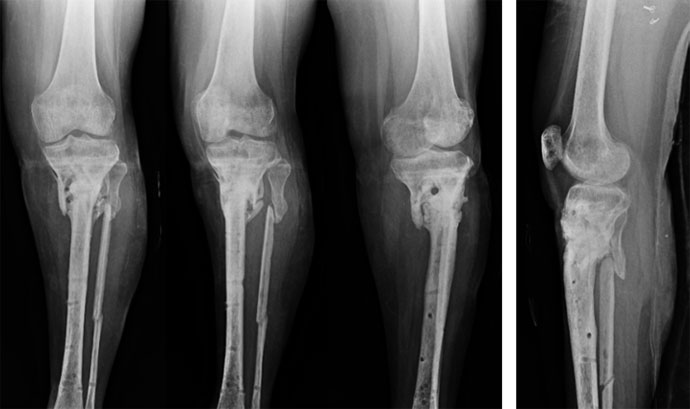 This 41 year old lay presented to us in 2008 with nonunion of left proximal tibia since 2001. This was a pretty difficult situation for her as she was diagnosed as a case of Multiple Myeloma. She was operated for the tumor in the tibia and thereafter several times for controlling infection and getting the fracture to unite. She was barely able to walk with support and on top of that was very much depressed. |