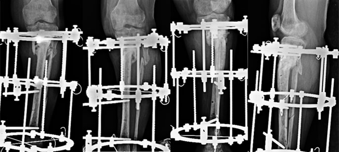 We took up the challenge and an Ilizarov ring fixator was applied. Gradual compression at the fracture site was done and patient allowed to ambulate full weight bearing. |