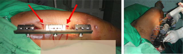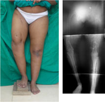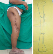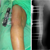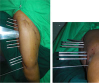 The schanz screws were placed perpendicular to the axis of the bony segment. Percutaneous osteotomies were then performed between the first and second set of schanz screws and the second and third set of schanz screws. Acute correction of varus and flexion deformities at the proximal osteotomy and correction of varus deformity at the distal osteotomy was done. The clamps and the rail were mounted and LRS (limb reconstruction system) fixator assembly was completed.