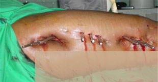 This picture was taken during surgery; shows the position of schanz screws in the sagittal plane. The proximal and middle group of screws are at an angle mimicking the flexion deformity of the proximal femur.