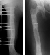 The picture on the right is taken right after the fixator removal. The radiolucent shadow is the broken piece of threaded screw impacted in the bone. Also seen are the tracts left behind in the bone in the places where the schanz screws had been before removal. These tracts get filled up with new bone in about 3 weeks time. During this time we advise “careful weight bearing,” i.e. walk full weight-bearing with the aid of a crutch or a stick. |