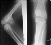 The picture on the right is the antero-posterior view of the knee joint. The tibia is seen as frontal, the distal femur appears oblique. |