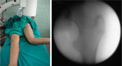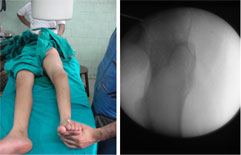 | These pictures were taken in the operating room for better understanding of the rotational deformity. The picture on the left was taken with the foot forward. The picture on the right shows the c-arm picture of the hip joint in the same position. The hip was in extreme internal rotation (normally this would have been in the mid-position, with both the lesser and greater trochanters visible). |