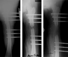 The criteria for removal of the fixator is formation of at least three cortices (out of four-anterior, posterior, medial & lateral). The fixator is removed after gradual disassembly. First the CD unit is removed and clamps are loosened. Patient is then asked to walk for about 10-15 minutes. If there is no pain or trouble then the next step is to remove the rail and clamps, the schanz screws remain in position. Again the patient is asked to walk for 10-15 minutes. Once this step is done comfortably, the schanz screws are removed usually in the out patient department itself. |