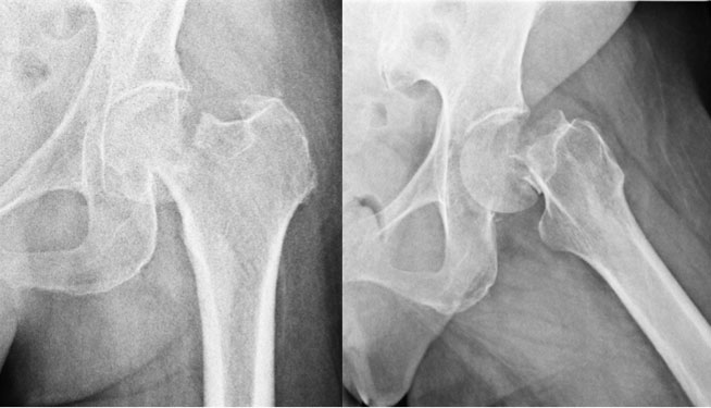 | This 54 year old lady, smoker, had a slip and fell on her hip. There was a fracture of the neck of femur on the left side. The options in such a situation are to either fix the fracture or replace the joint either half (Hemiarthroplasty-only the ball of the joint is replaced) or complete (Total Hip Replacement-boththe ball & socket are replaced). |