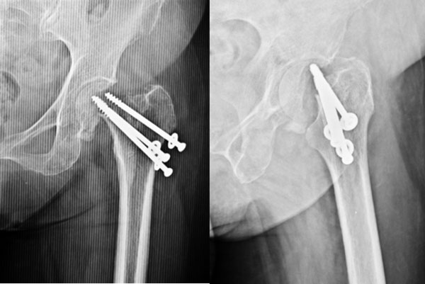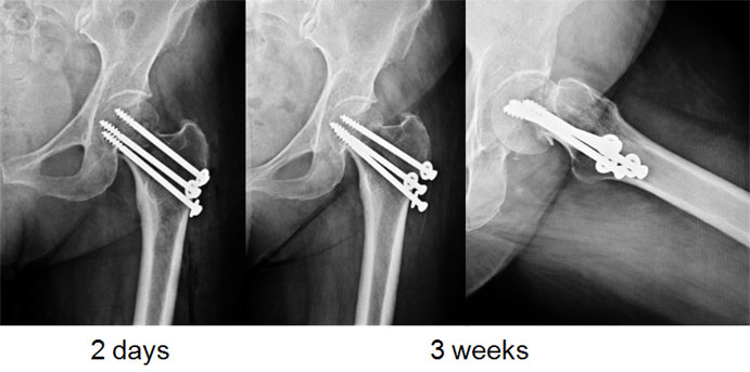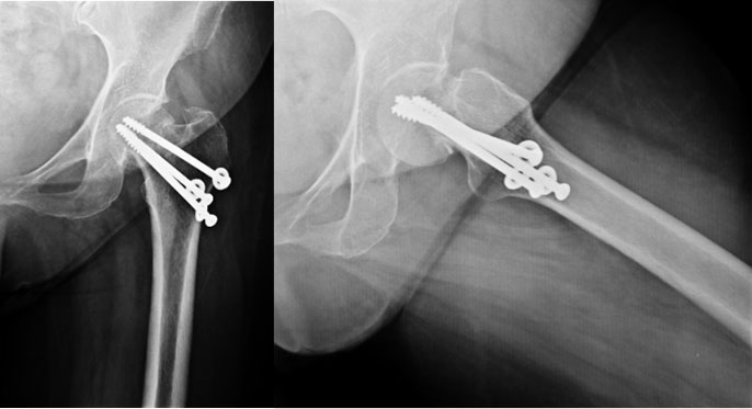 Since the hip joint was normal before the fracture, it was decided (with patient’s consultation) to do a fixation and try and salvage the hip. A closed reduction and percutaneus cancellous screw fixation (minimally invasive) was done. |