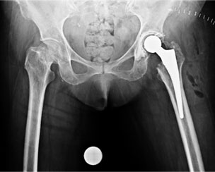 | The xray picture after total hip replacement. The socket (acetabular cup) was fixed with bone cement whereas the femoral stem is uncemented. The length of the limb has been restored. |