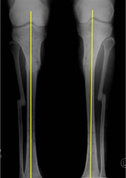 In the example shown here, the patient had a varus deformity of both tibiae (bow legs – reduced angle at the bone below the knee) with slight external rotation deformity of the tibiae (the feet pointing outward while the patellae [knee caps] face forward).